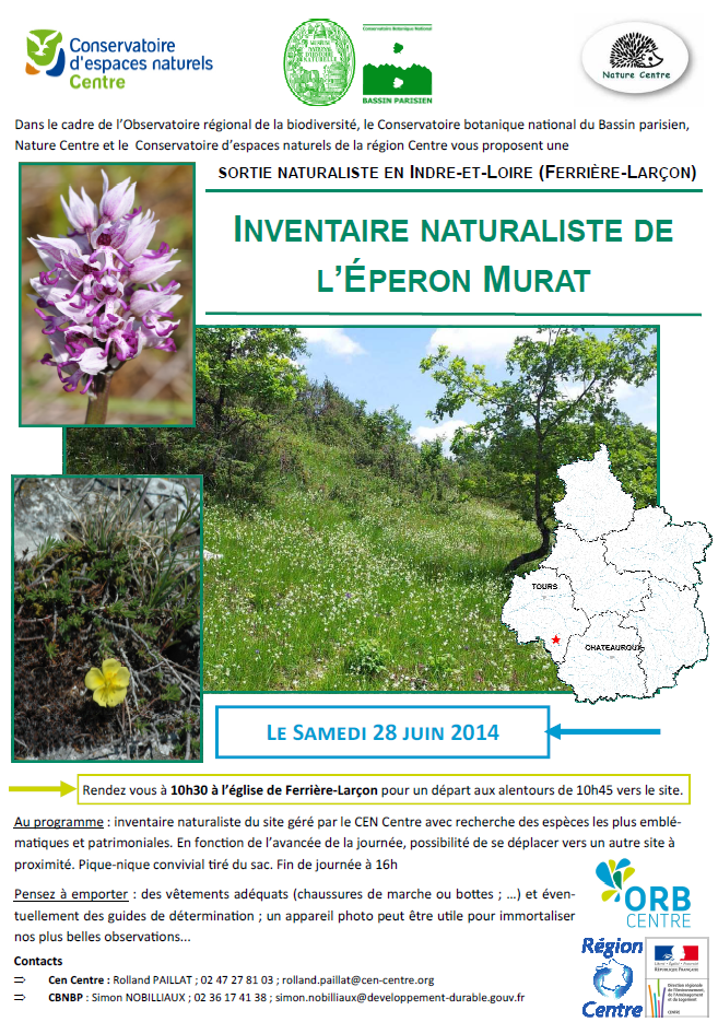 Dans le cadre de l'Observatoire Régional de la Biodiversité, le Conservatoire botanique national du Bassin parisien s'associe au Conservatoire d'espaces naturels de la région Centre, avec la collaboration de Nature Centre, pour une sortie naturaliste sur les pelouses et boisements calcaires de l'Éperon Murat à Ferrière-Larçon (37), un site géré par le Cen Centre, le samedi 28 juin 2014.