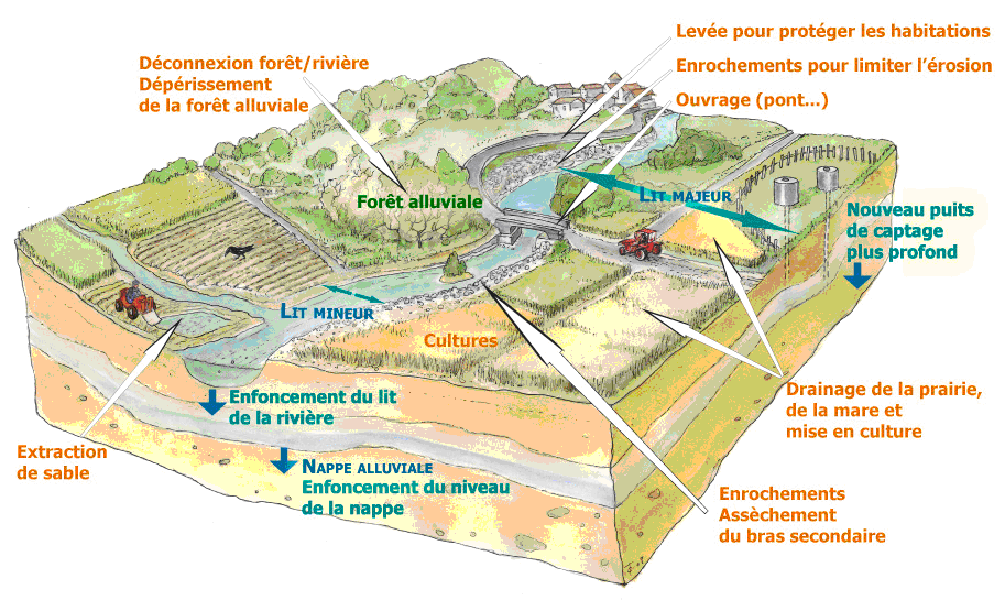 Depuis toujours, les cours d’eau ont favorisé l’installation des hommes. Ces derniers les ont aménagés pour s’en protéger (avec des levées) ou pour s’en servir (avec des barrages ou des duits pour créer des chenaux de navigation toujours en eau). Ils ont aussi extrait le sable de leur lit pour leurs matériaux de construction. Toutes ces interventions ont eu un impact fort sur l’ensemble des cours d’eau de France et de la région.