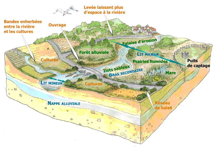 L’artificialisation et la pollution de certaines rivières sont telles que toute action ponctuelle a peu d’impact. Le cours d’eau doit faire l’objet d’une gestion globale. Préserver un espace de liberté où la rivière peut divaguer, se recharger en sable à droite ou à gauche et non plus seulement au fond de son lit, est fondamental. Limiter les sources de pollution en réduisant l’utilisation de produits phytosanitaires et tenter de créer des zones tampon entre cultures et eau (bandes herbeuses où les produits peuvent être retenus) sont quelques actions susceptibles de contribuer à l’amélioration de la ressource en eau, si tant est qu’elles puissent être mises en pratique à des échelles et sur des surfaces suffisantes.