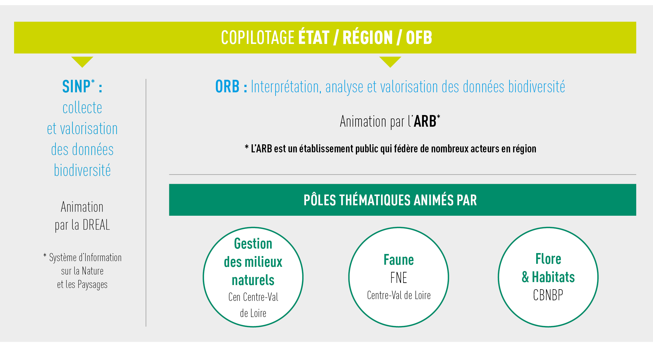 L’État, la Région et l’OFB, conscients de la nécessité de mieux connaître la biodiversité régionale, co-pilotent l’ORB. Ils s’appuient sur un groupe de travail pour en définir les orientations et les programmes d’actions. Ce groupe de travail regroupe des représentants des associations naturalistes, de l’ARB, de l’État, de l’OFB et de la Région. Le SINP, piloté par l’État, capitalise les données naturalistes transmises par les différentes associations. L’ORB valorise ces données, notamment au travers des indicateurs de la biodiversité. Les éléments de cadrage sur le fonctionnement du SINP et de l'ORB sont détaillés dans la Charte Regionale SINP-ORB.