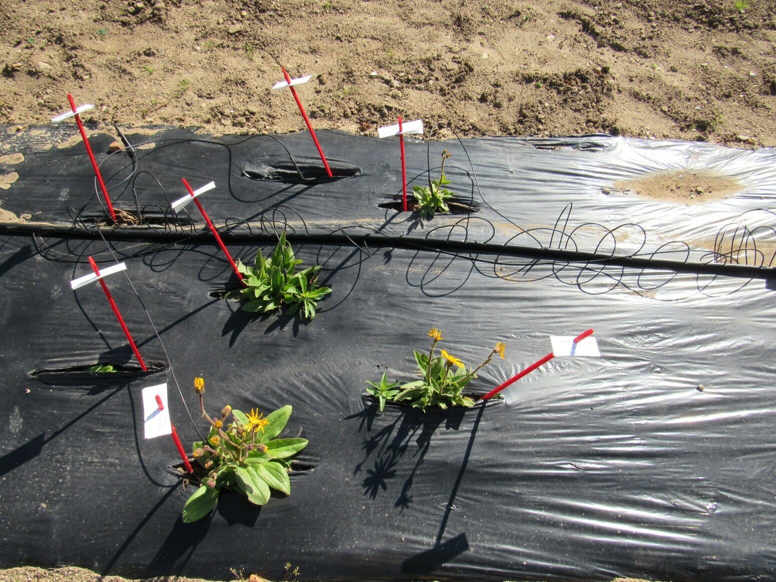 Après autorisation de prélèvement dans le milieu naturel, des plants de Flûteau nageant (Luronium natans) et d’Arnica des montagnes (Arnica montana) ont été mis en culture au CDHR Centre-Val de Loire dès 2018. La culture d’Arnica des montagnes s’est faite en pleine terre, avec paillage plastique pour limiter la concurrence des adventices et irrigation au goutte à goutte avec de l’eau claire (Figure 1).